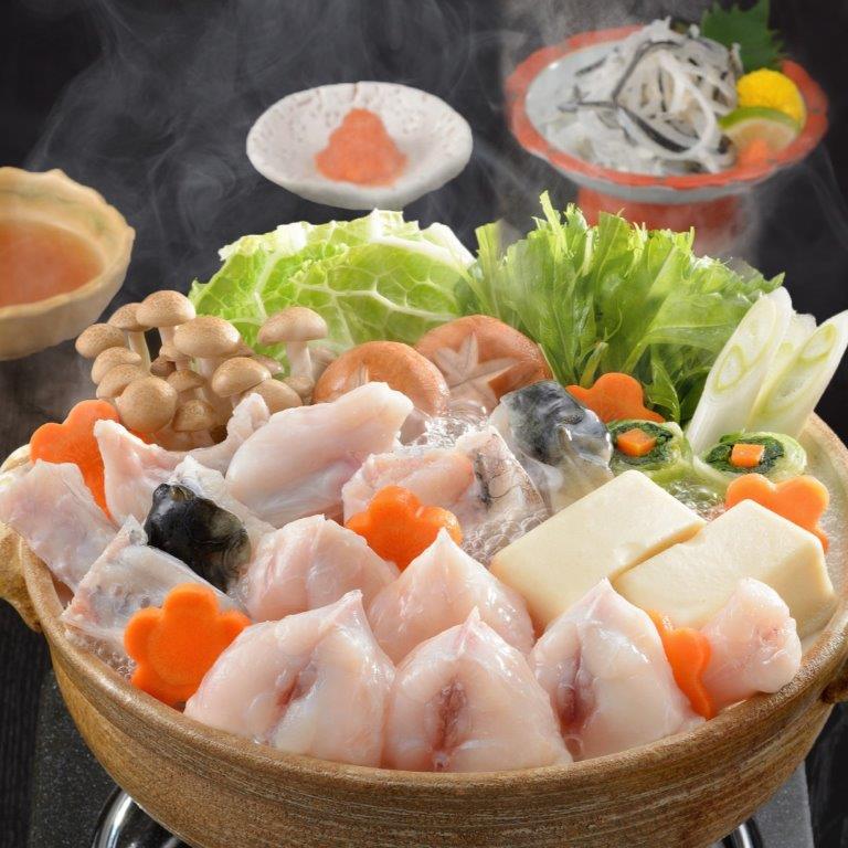 弾力ある食感と噛むほどに旨みがあふれるちり鍋。しろさばふくととらふくアラをぶつ切りにし、こりこりとした食感が堪らない「とらふく皮」をセットにしました。ちり鍋後の残ったスープで味わう「ふく雑炊」は格別です。