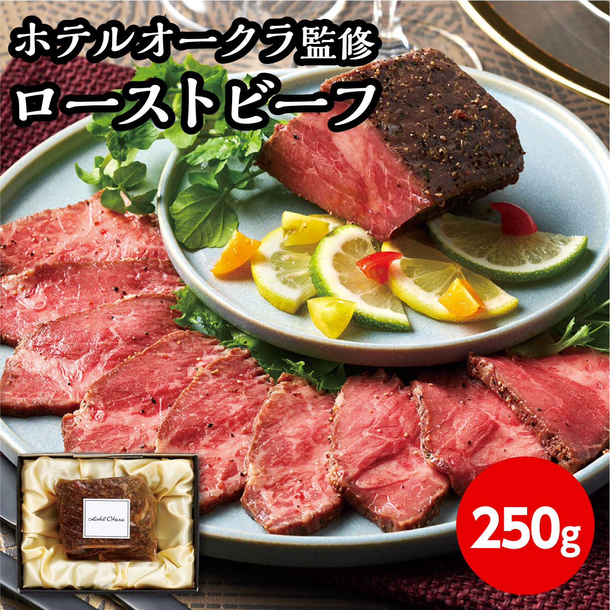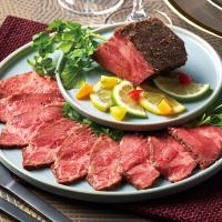 ホテルオークラ監修の国産牛のローストビーフです。モモ肉を、低温でじっくり加熱する「真空調理製法」で仕上げました。スパイス感がございますのでそのまま召し上がれます。