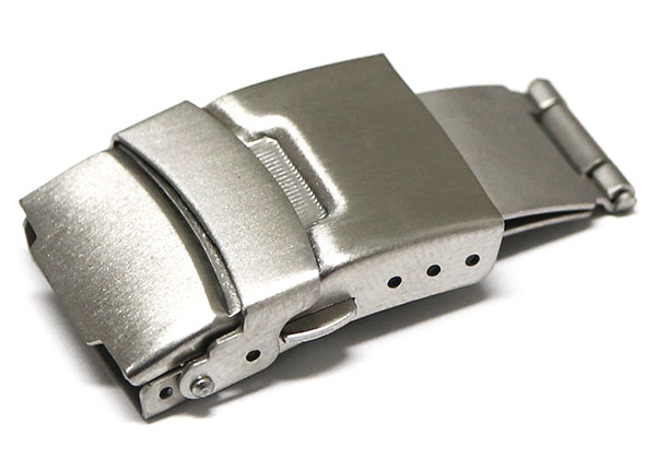 腕時計メタルバンド用三つ折れバックル。両サイドをプッシュしてオープンするセーフティーロックがついたダブルロックタイプになります。サイズ展開は16mm、18mm、20mm、22mmとなります。スプリングバーと着脱工具を付属しております。