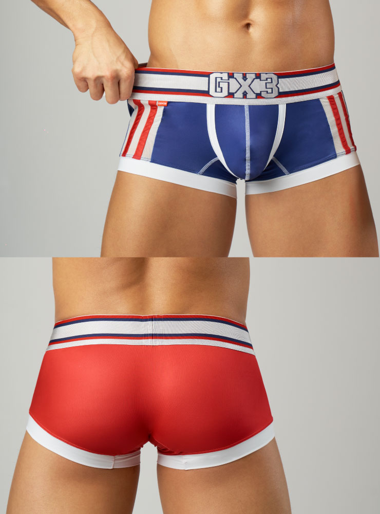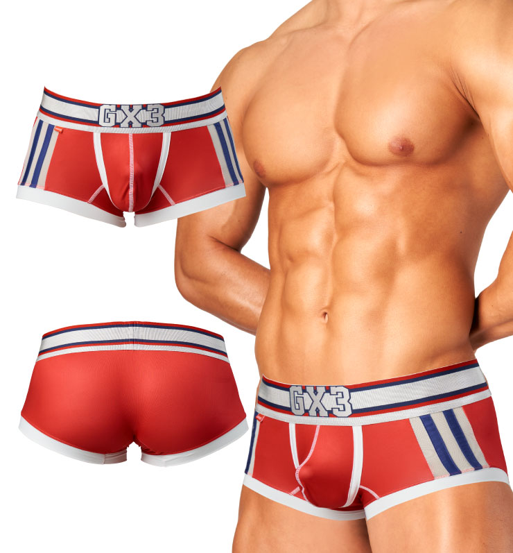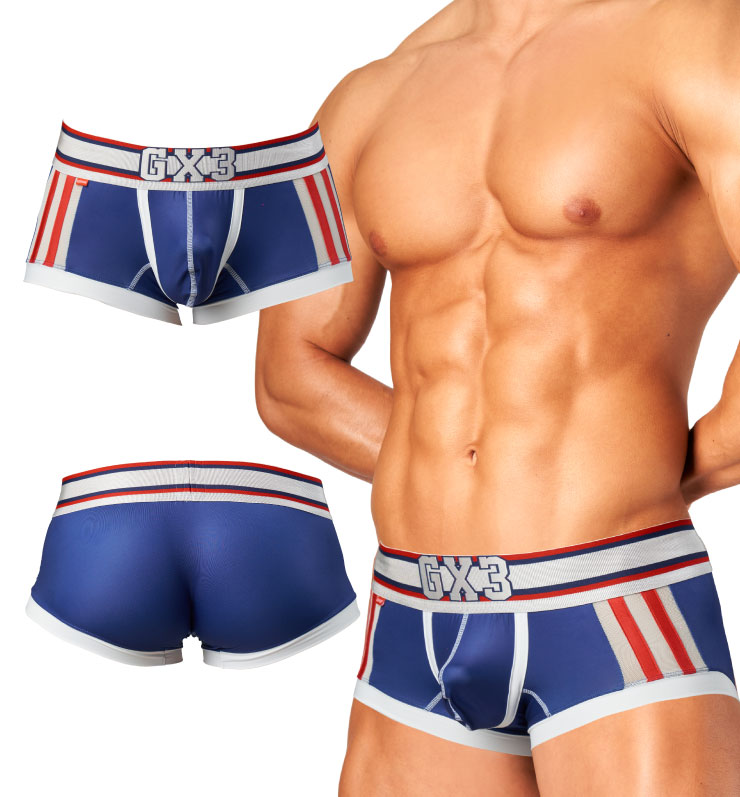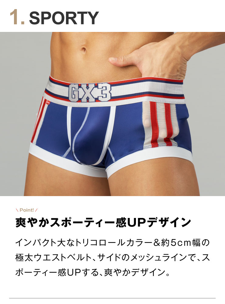 トリコロールカラー&約5cm幅の極太ウエストベルトが目を惹く、スポーティーデザインボクサー。ポーチ&脚まわりの縁取りのホワイトアクセントと、サイドのメッシュラインで、デザイン全体の爽快感がUPする仕上がり。