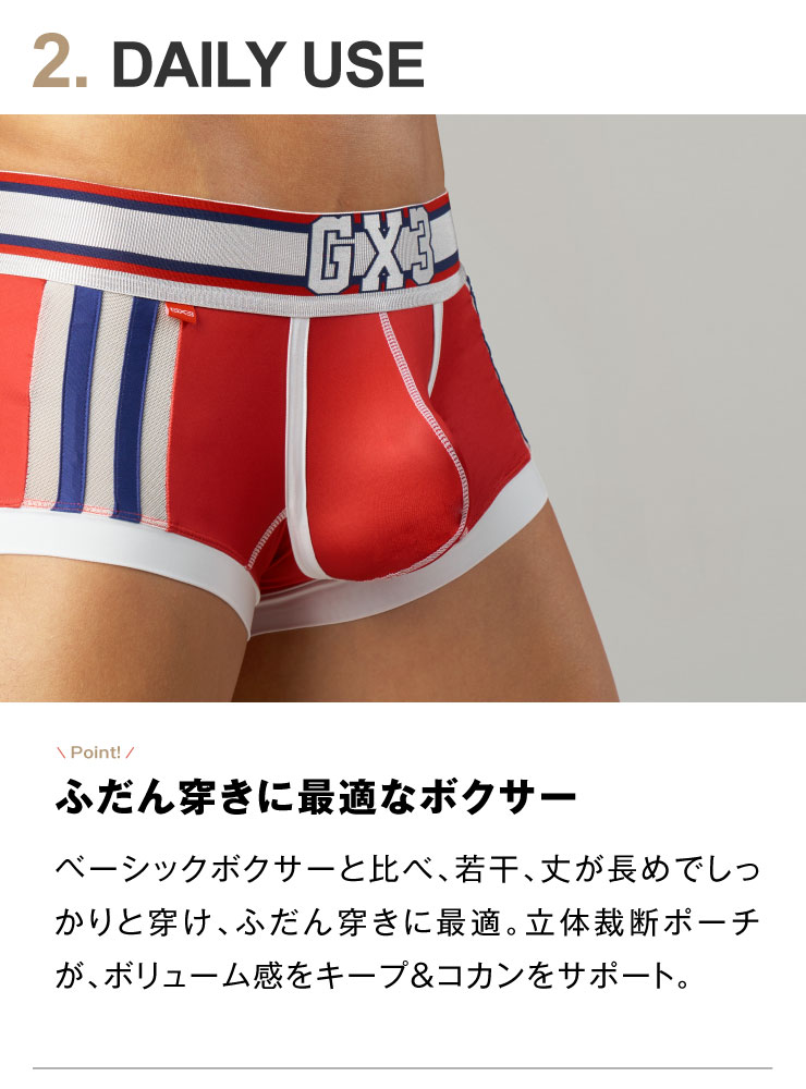 立体裁断のフロントポーチが、ボリューム感をキープ&コカンをサポート。ベーシックボクサーと比べ、若干、丈が長めでしっかりと穿けるので、ふだん穿きに最適。滑らかな光沢生地は、程よい伸縮性で、フィット感バツグン。
