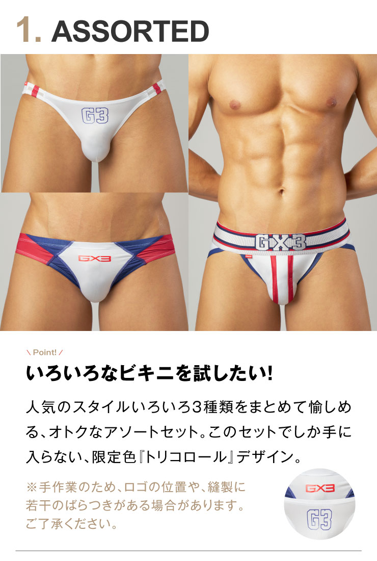 Vビキニ、SPLASHビキニ、アスレティックブリーフ、人気のスタイル3種類をまとめて愉しめる、お得なアソートセット。