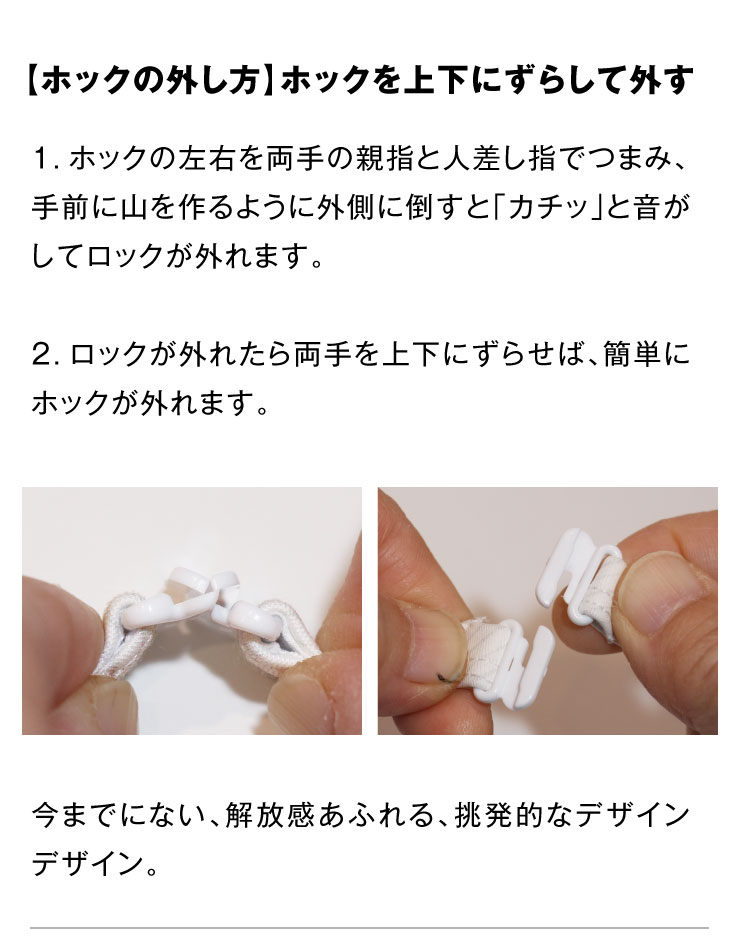 フロントとバックの生地がセパレートになっていて、動きやすく、バツグンの穿き心地。両サイドにはホックが付いているので、外して脱ぐコトもできるユニーク仕様。解放感あふれる、挑発的なデザイン。