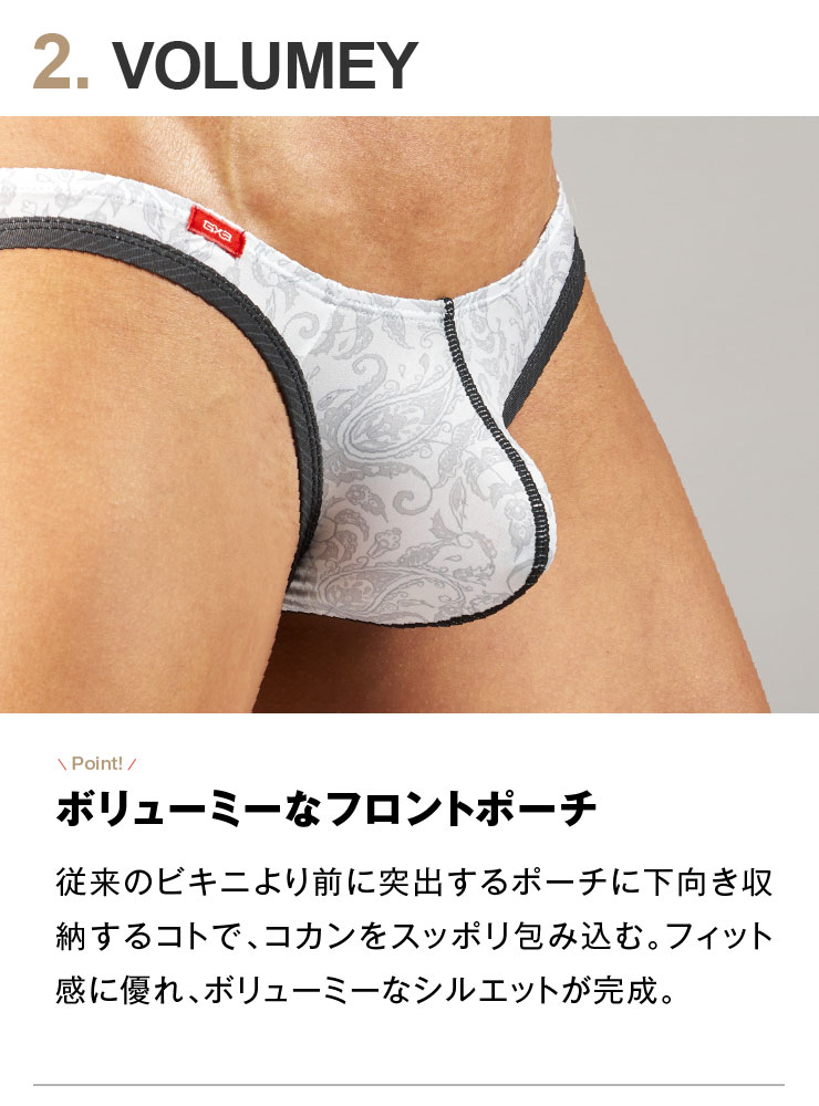 従来のビキニより前に突出する立体構造ポーチに、コカンをすべてスッポリ下向き収納するコトで、フィット感が良く、ボリューミーなシルエット。お尻の丸みに沿って包み込む、流線型のヒップライン。脚周りの縁取りがピッタリとフィットして、バツグンの穿き心地。