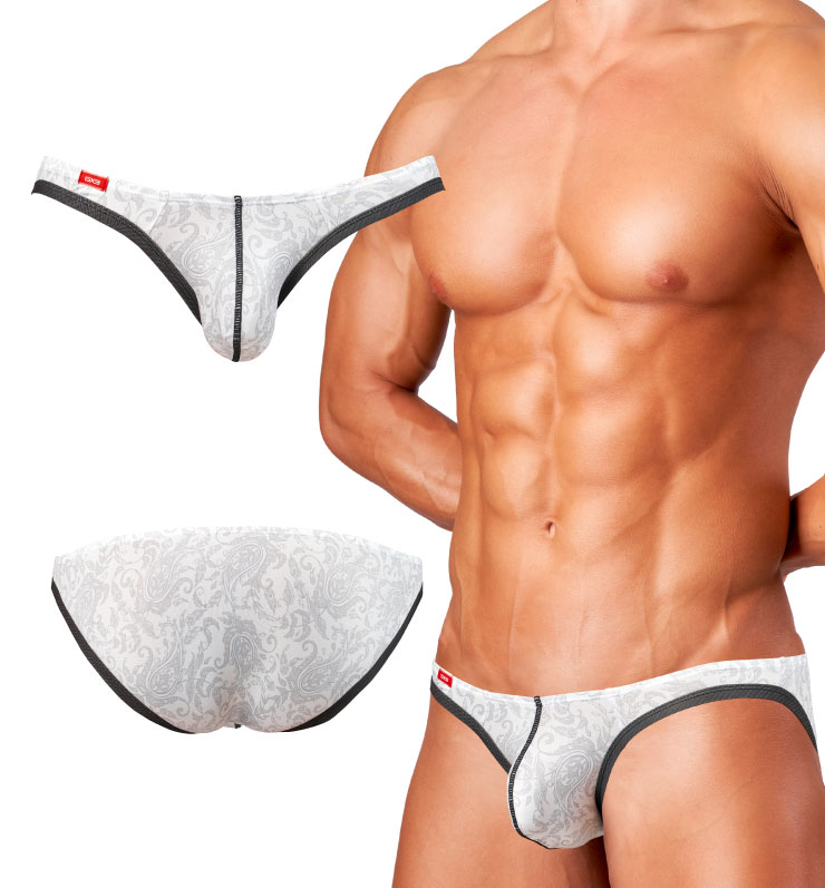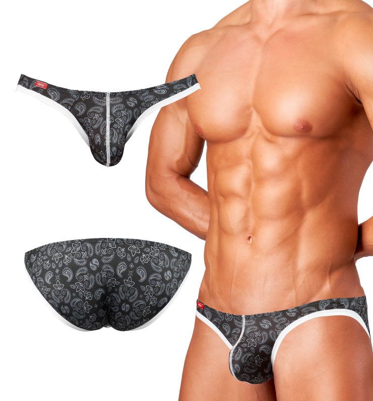 スッキリしたシルエットで逞しいボディラインをより際立たせるVビキニ。ほどよい伸縮性の滑らかな光沢生地全面、2種類のペイズリープリントが彩る華やかな雰囲気のデザイン。モノトーンで派手さが抑えられた、カジュアルな仕上がり。