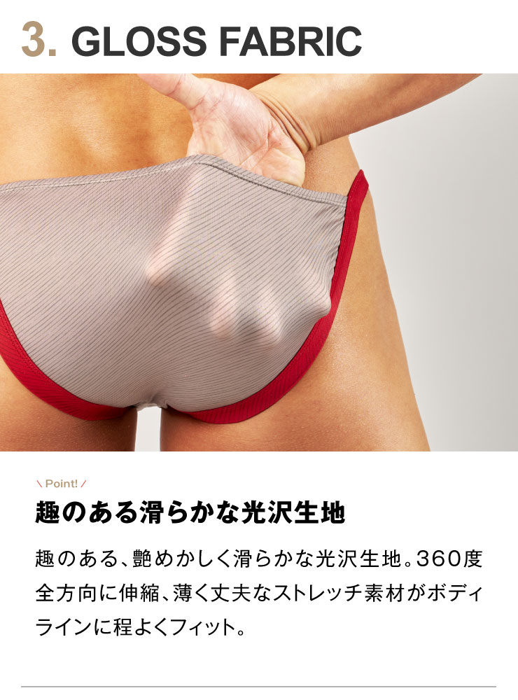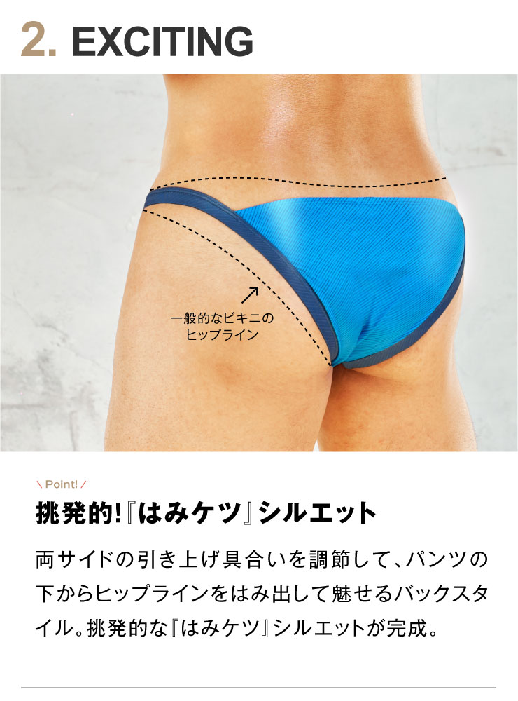 バックは、両サイドの引き上げ具合いを調節して、パンツの下からヒップラインをはみ出して魅せる『はみケツ』シルエットが愉しめる。サイドからバックにかけて、ボリューミーなお尻をアピールしつつ、ボリューム感&フィット感UP。