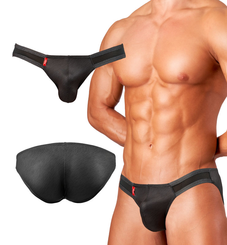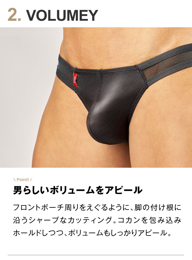 ビキニ特有のコカンを包み込む、立体裁断のフロントポーチ。フロントポーチ周りをえぐるように、脚の付け根に沿うシャープなカッティング、コカンを包み込みホールドしつつ、ボリュームもしっかり強調。