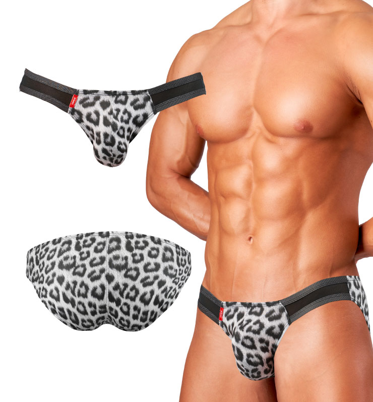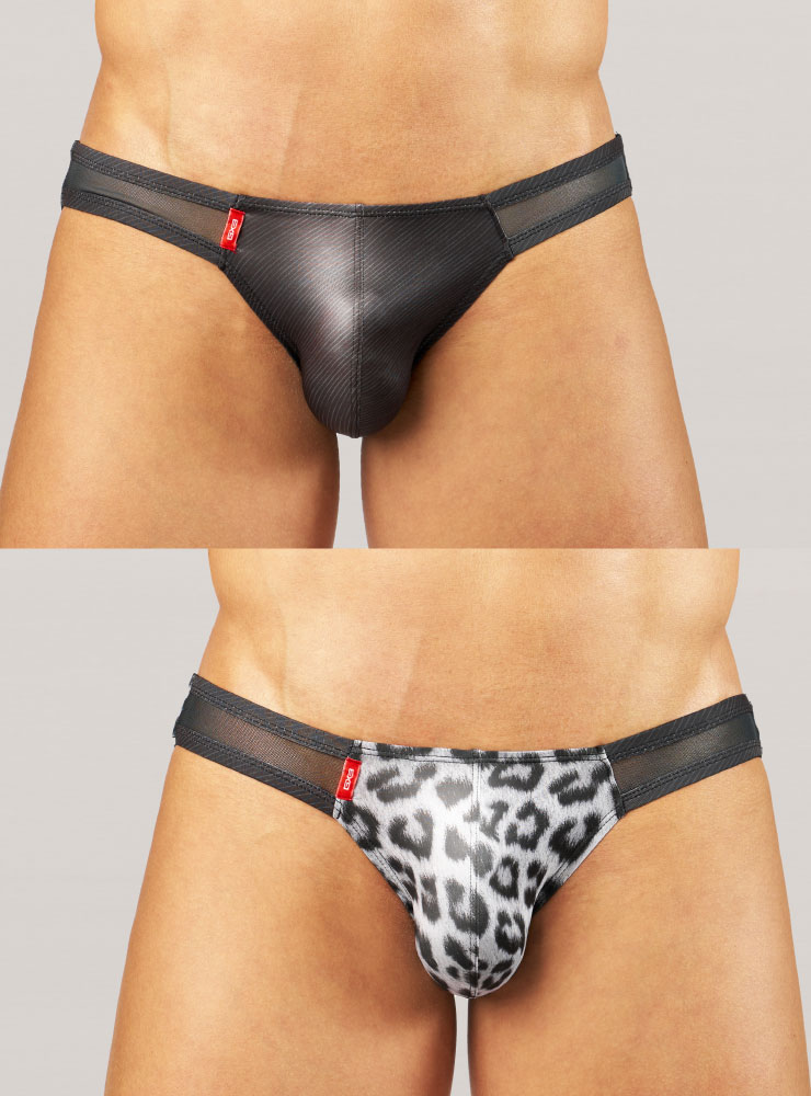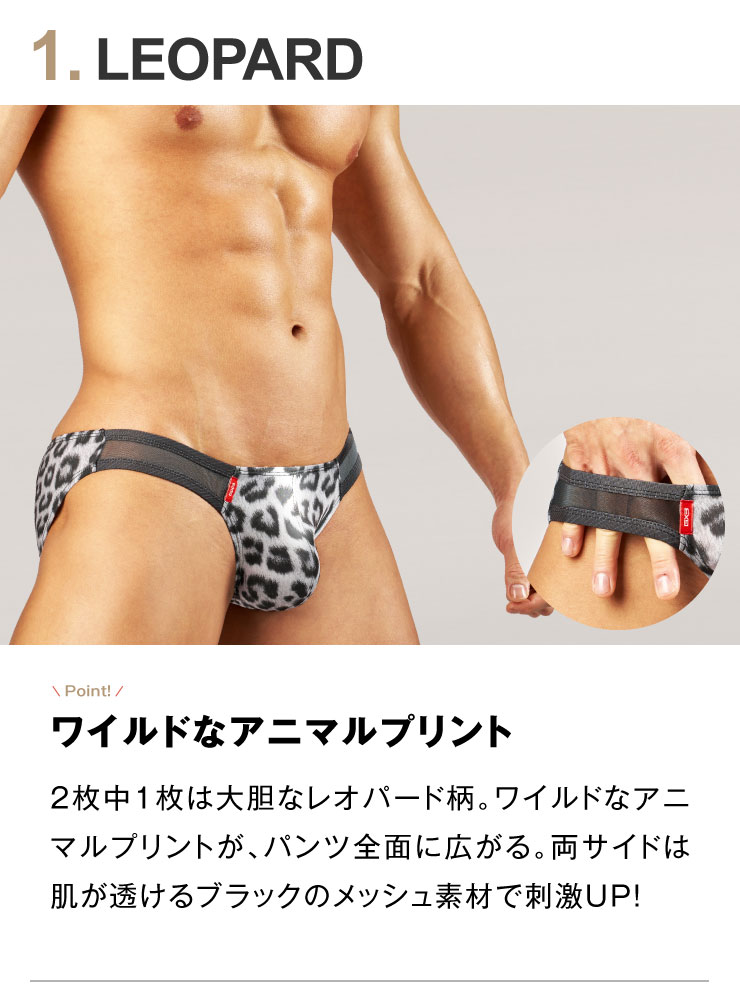 迫力のあるワイルドなアニマルプリントのレオパード柄と、全面にラインを入れたブラックの2種デザインを愉しめるビキニセット。両サイドはブラックのメッシュ素材で、部分的に肌が透けて刺激UP!