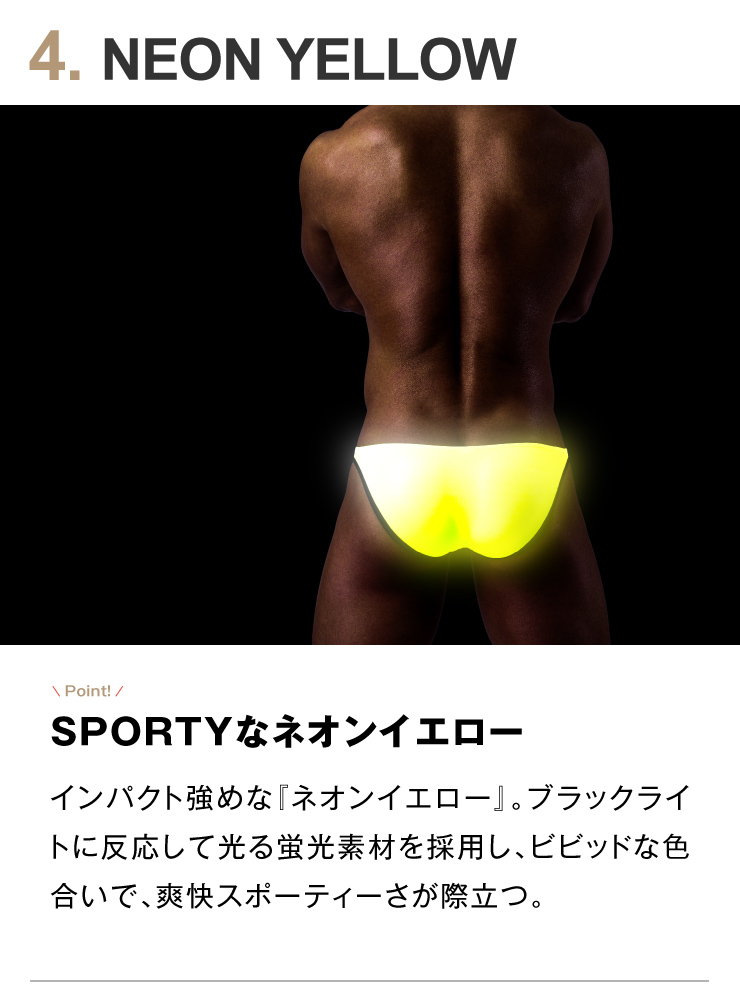 ネオンイエローは、ブラックライトに反応して光る蛍光素材を採用し、ビビッドな色合い。
