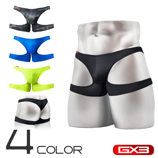 乗馬の際、カウボーイがボトムスの上から着用するカバーをGX3流に大胆アレンジしたチャップスを、マイクロシェイプに改良。さらに生地面積の少ない、解放感あふれる『肌魅せワイルドスタイル』誕生。滑らかな光沢生地は、程よい伸縮性で、フィット感バツグン。