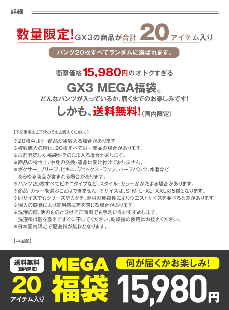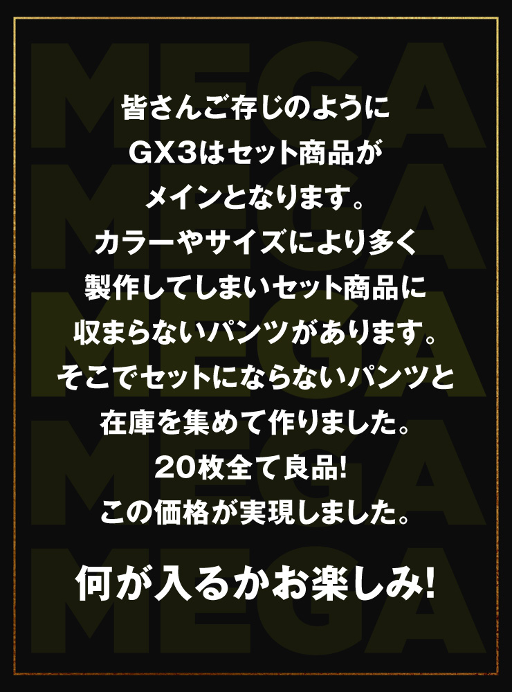 日ごろの感謝をこめて、良質のGX3パンツをランダムに20枚集めた、大ボリュームの福袋にしました。