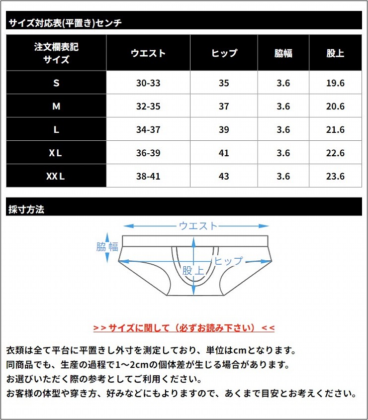 同サイズを並べると若干差がございますが、伸縮性に優れた生地ですので着用するとカラダにフィットいたします。