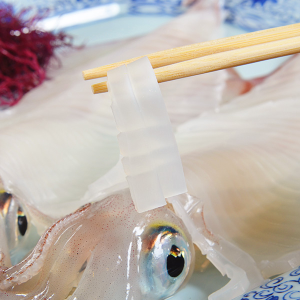 豊洲市場では白いかと呼ばれているいかです。夏を代表するいかで、いかの中でも甘みが最も強い種です。イカの中でも高級な部類で夏の寿司ネタとして人気があります。胴体はお刺身でお召し上がりください。ねっとりとして甘み旨味があり旨いです。耳や下足は軽く炙るか、湯通しすると美味しくなります。