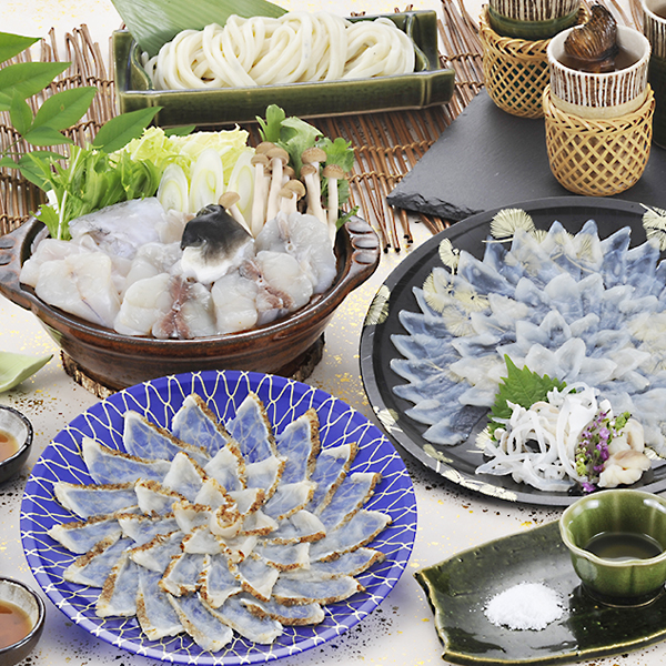 「ひれ酒」を味わいながらいただく「皮」や「ちり鍋」には「ふくうどん」も入って、ご家族や知人を囲んで、楽しいひとときを演出します。