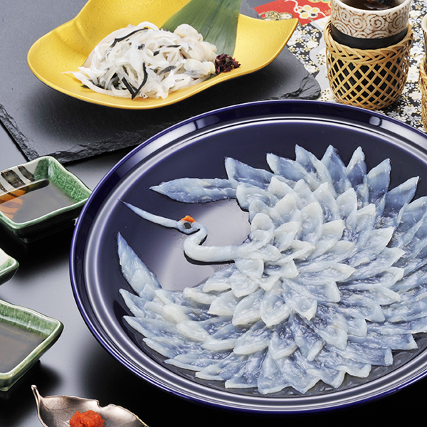 【内容(量)】とらふく刺身鶴盛り110g(陶器皿30cm)、とらふく皮40g×2、ひれ酒用ヒレ5枚、ポン酢35g×4、モミジオロシ16g、塩5g、カボス果汁2ml×4