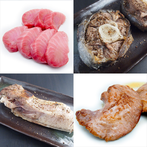 マグロの希少部位4種(頭肉、ほほ肉、カマ、尾の身)は単品でも取り扱っておりますが、価格以上に美味しく非常に好評なので、セットにして単品の合計より少し安くご提供することにしました。