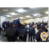 一日に多くて8000枚ものうにを手際よく競ります。朝5時からうにの競りは始まります。うにを扱う豊洲(旧 築地)市場の荷受(大卸)は5つあり、2社同時に競り台に登り競りをかけます。競り値をいれるのは買参権を持った仲卸で、当日の状況を見て値段を出します。荷受や他の仲卸との駆け引きの中、狙ったうにを競り落とします。