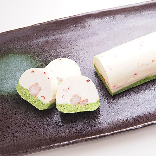 芯に使用している海老の香りと食感がよいテリーヌです。白と緑の対比がきれいな二層になっています。