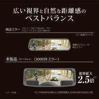 本製品は半径3000mmの球体から切り出された緩曲面鏡です。(3000SRとは半径3000mmの球体の曲率を指します。)一般的な曲面鏡のように鏡の曲率を大きくすると(1400SR等)広い範囲を映し出すことができますが、その反面、実際の像より映し出される像が小さくなっていきます。そのため、実際の距離感より、より遠く感じます。そこで、本製品はワイドな視界と自然な距離感のバランスを考えた曲率である3000SRに設定しています。純正ルームミラーの平面鏡より広い範囲の光を反射する(映す)ことができるので、純正ルームミラーと比べて視界面積が約2.5倍※に広がります。(※TOKAIDENSO 001は約2.5倍、ICHIKOH8224は約2.3倍) 均一な球曲面から切り出されたミラーだからこそ、歪みのないハッキリとした像を映し出すことができます。