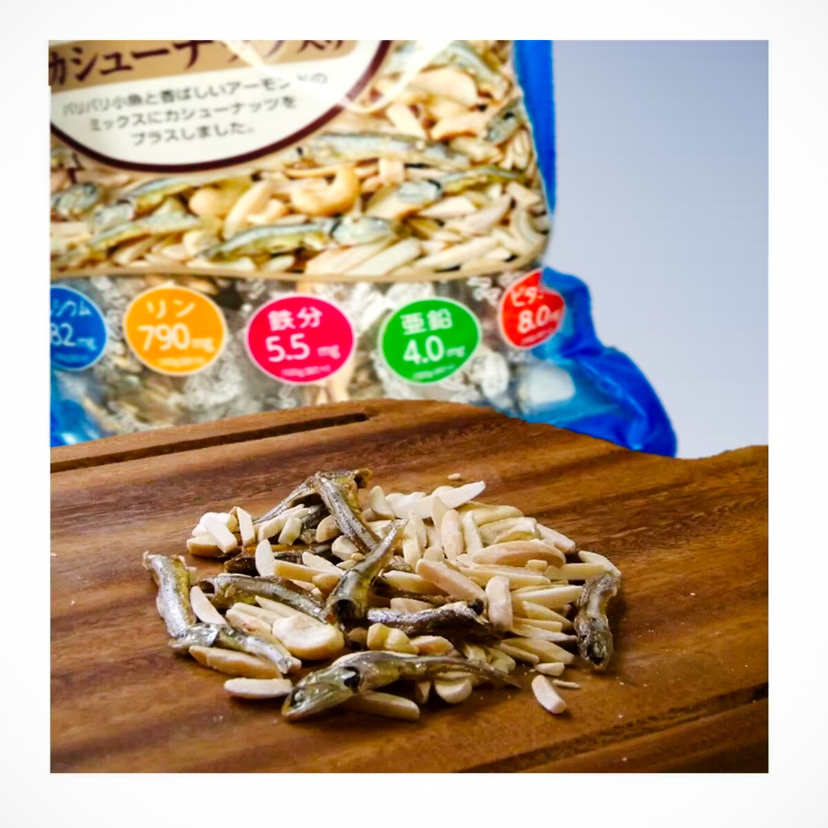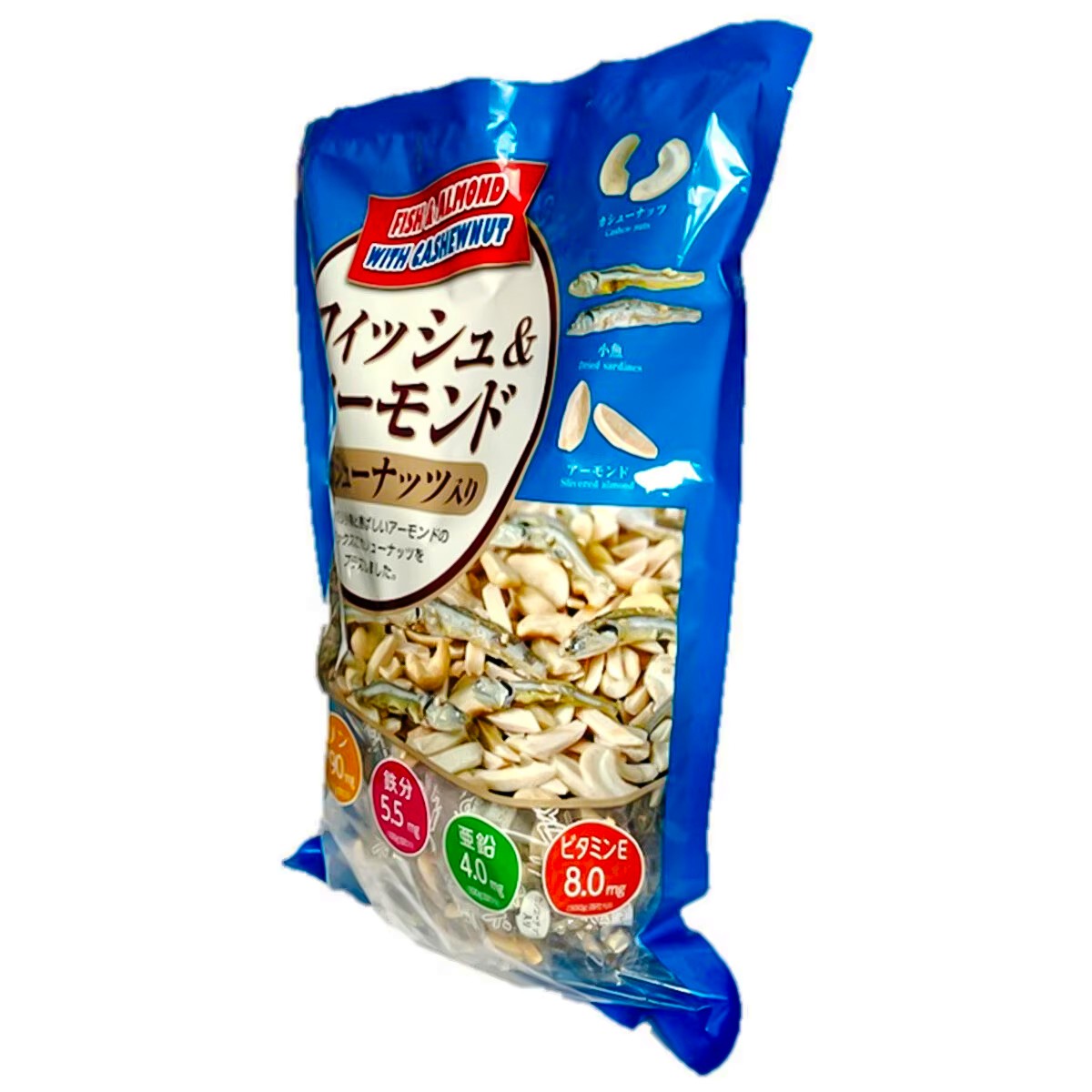 小魚と香ばしいアーモンドのミックスに、ほんのり甘いカシューナッツをプラスしました。