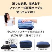 【ファスナー圧縮】 中央のファスナーを締めることで女性でも簡単に中身を圧縮できます。真空圧縮袋のように空気を抜く手間がありません。旅行、出張時の衣類の仕分け整理に活躍する収納バッグ。