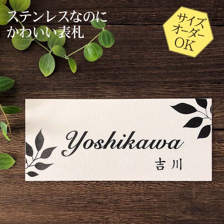 表札 梨地ステンレス リーフ E18 浮き彫り 凸文字 サイズ変更できる マンション用 戸建用 おしゃれ