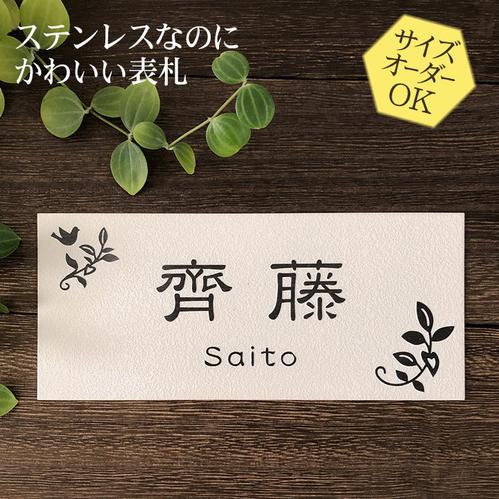 表札 梨地ステンレス リーフと小鳥 H9 浮き彫り 凸文字 サイズ変更できる マンション用 戸建用 おしゃれ