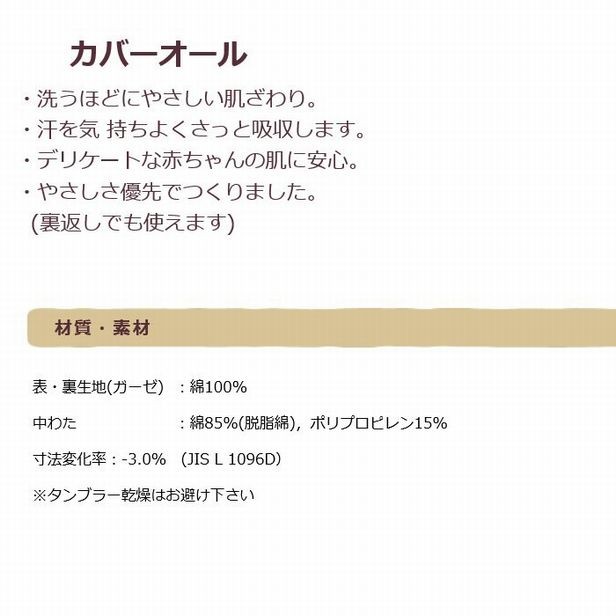 | 素材 | 表側・裏側 : 綿100%(ガーゼ) 中わた : 綿85%(脱脂綿),ポリプロピレン15% |