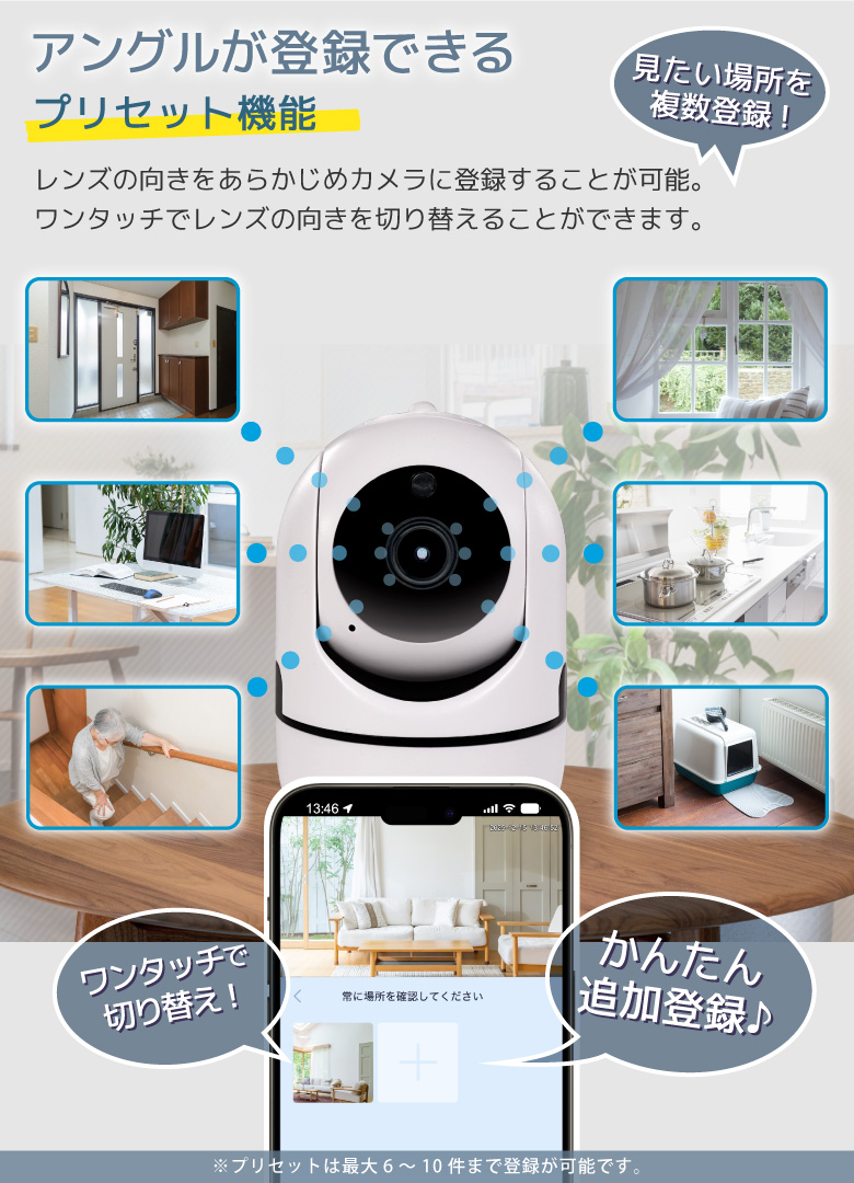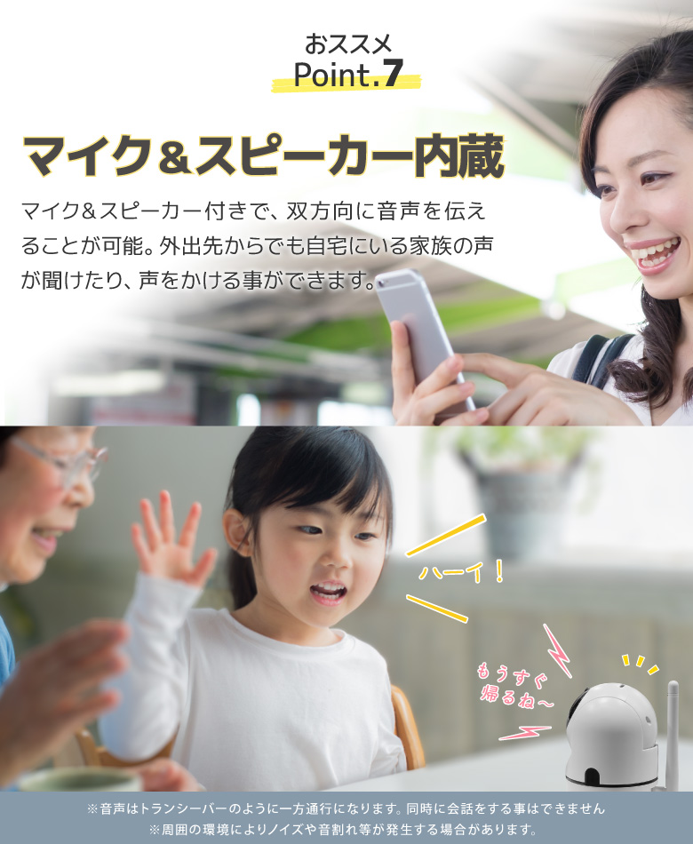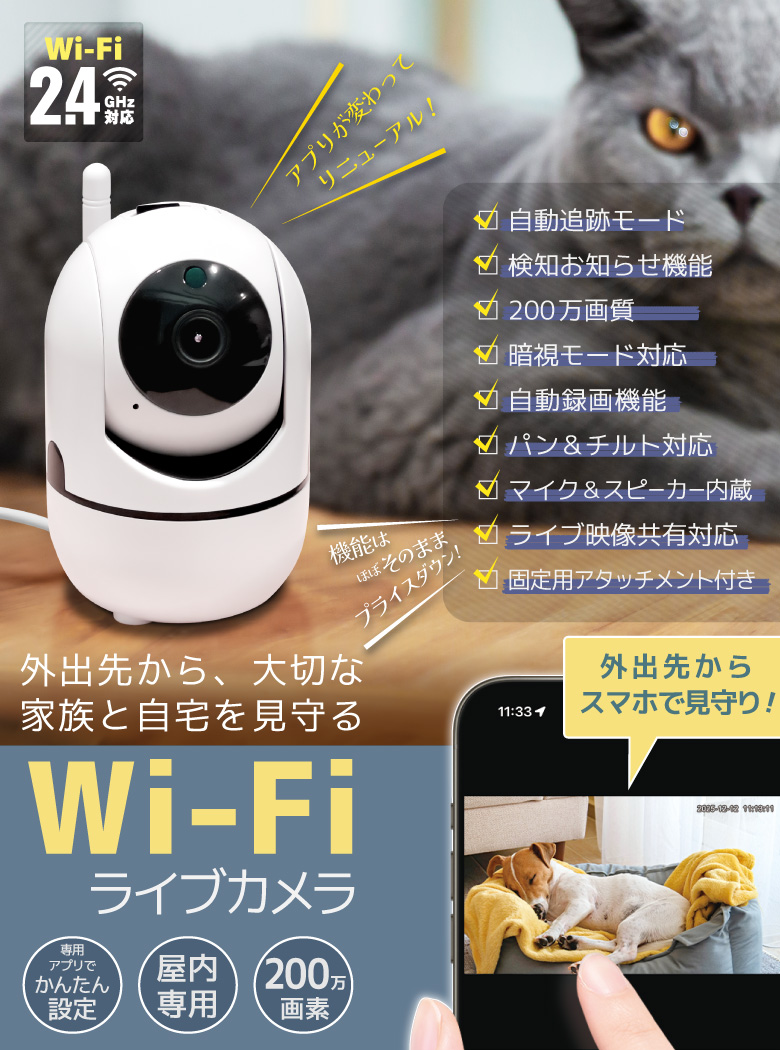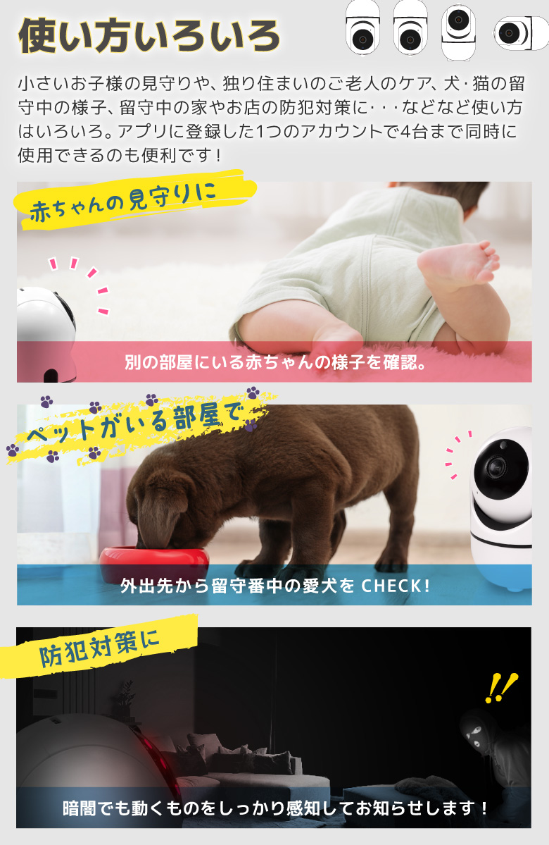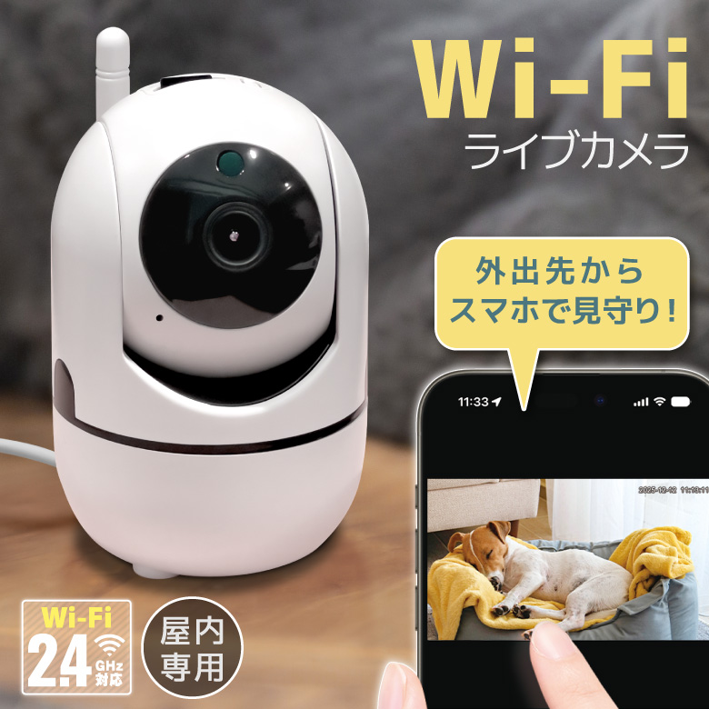 | 商品説明 | 外出先からスマホで自宅を見守ることができるWi-Fiネットカメラです。外出先でペットの様子をチェックしたり、別室にいる赤ちゃんの見守りなど使い方はいろいろ。簡易防犯にも使えます。 |