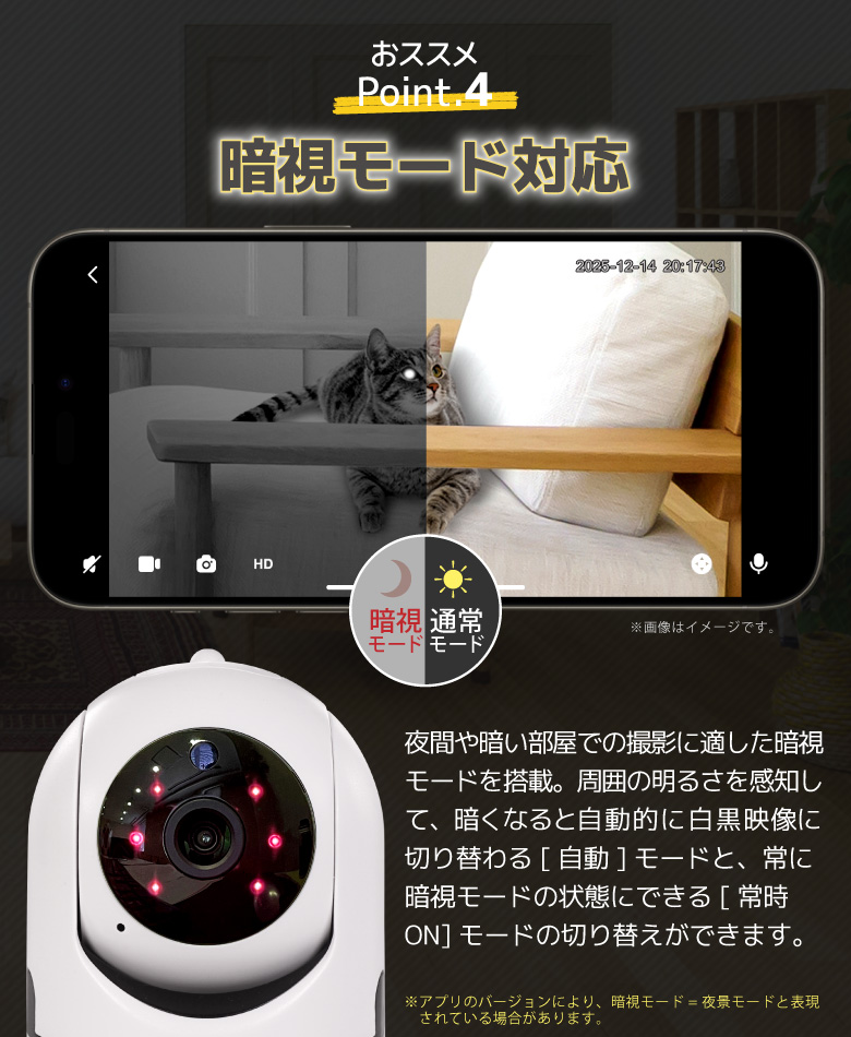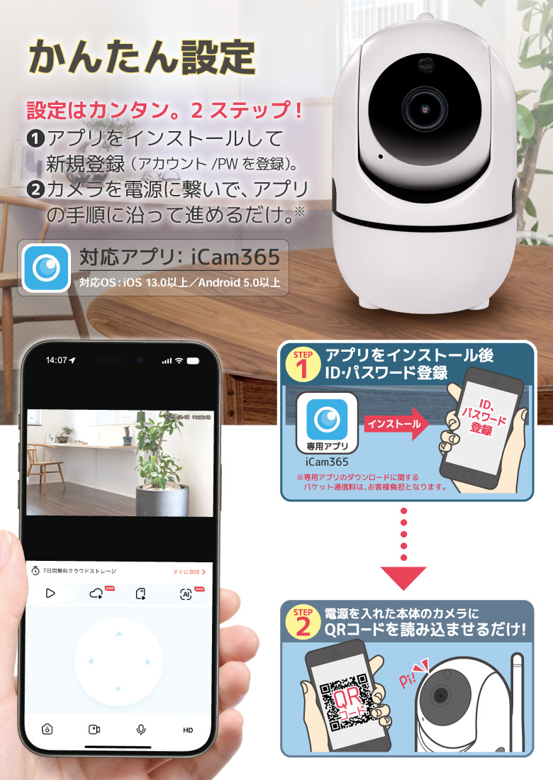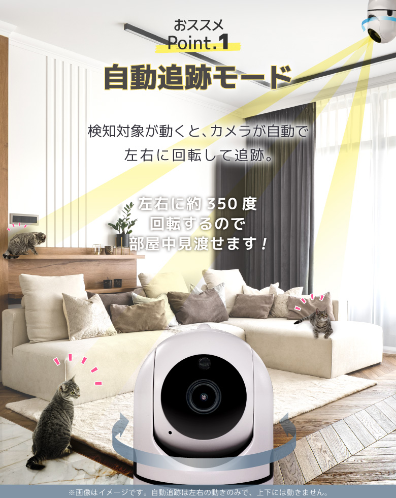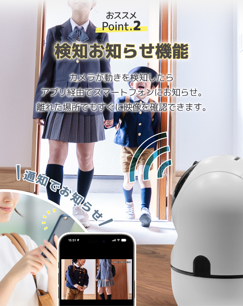 | 商品説明 | 外出先からスマホで自宅を見守ることができるWi-Fiネットカメラです。外出先でペットの様子をチェックしたり、別室にいる赤ちゃんの見守りなど使い方はいろいろ。簡易防犯にも使えます。 |