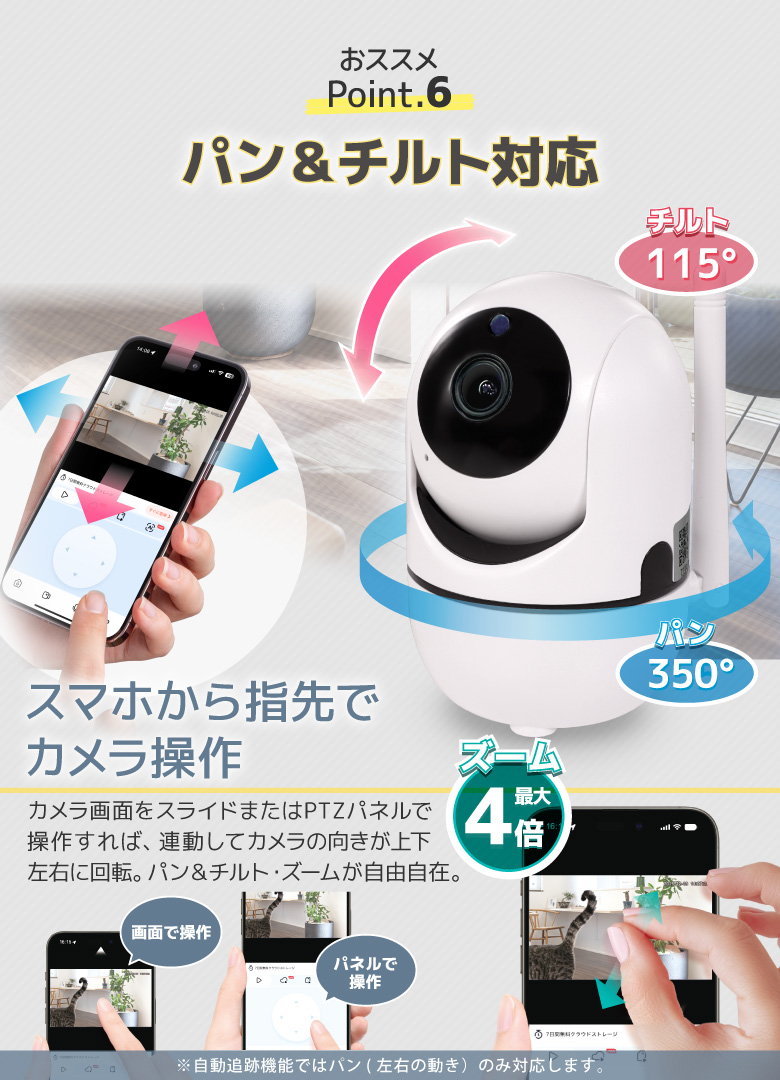 | パン/チルト範囲 | パン:350度チルト:115度 |