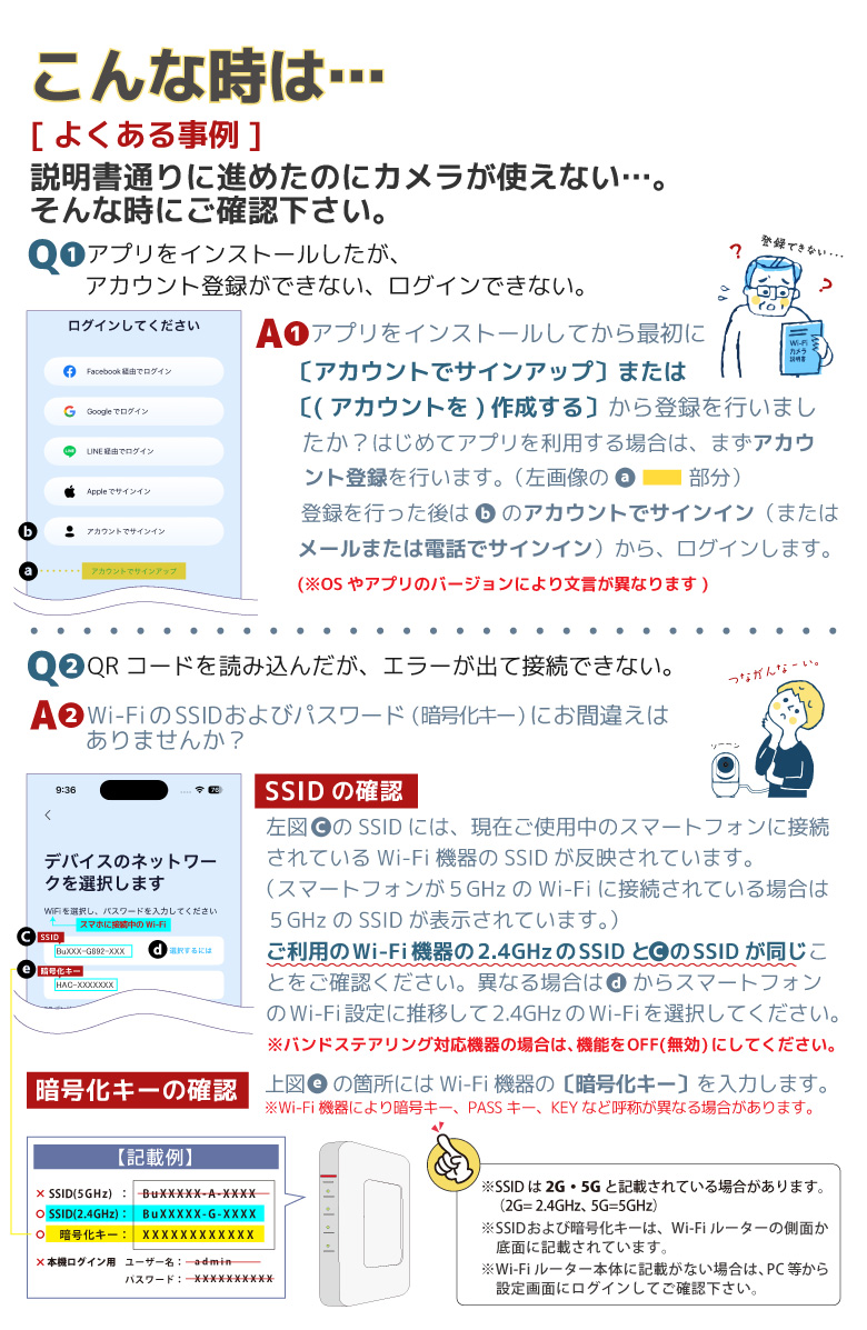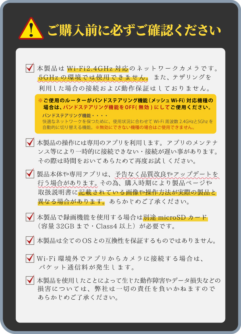| 留意事項 | ※本製品のご使用にはWi-Fi環境が必要です。また、Wi-Fiの周波数は【2.4GHz】のみ対応しております。(※5GHzには対応しておりません。)事前に必ずご利用になるWi-Fi環境の周波数が2.4GHzか確認してください。※本製品にはmicroSD(32GBまで/Class4以上)が必要です。別途市販されているものをご用意ください。※USB変換アダプター(USB充電器)は付属しておりません。別途ご用意ください。※本製品は屋内専用です。※本製品ご利用には専用アプリのインストールが必要です。※製品本体や専用アプリは予告なく品質改良やアップデートを行なう場合があります。購入時期によっては記載されている画像や操作方法が実物とは異なる場合がございます。あらかじめご了承ください。※スマートフォンの通信状態や専用アプリサーバーのメンテナンスなどにより接続しづらい・動作が正常に行なわれない場合があります。その場合は時間を置いてから再度お試しください。※通信料はお客様負担となります。動画の確認には大容量通信が必要となりますのでご注意ください。※本製品はすべてのOSとの互換性を保証するものではありません。 |