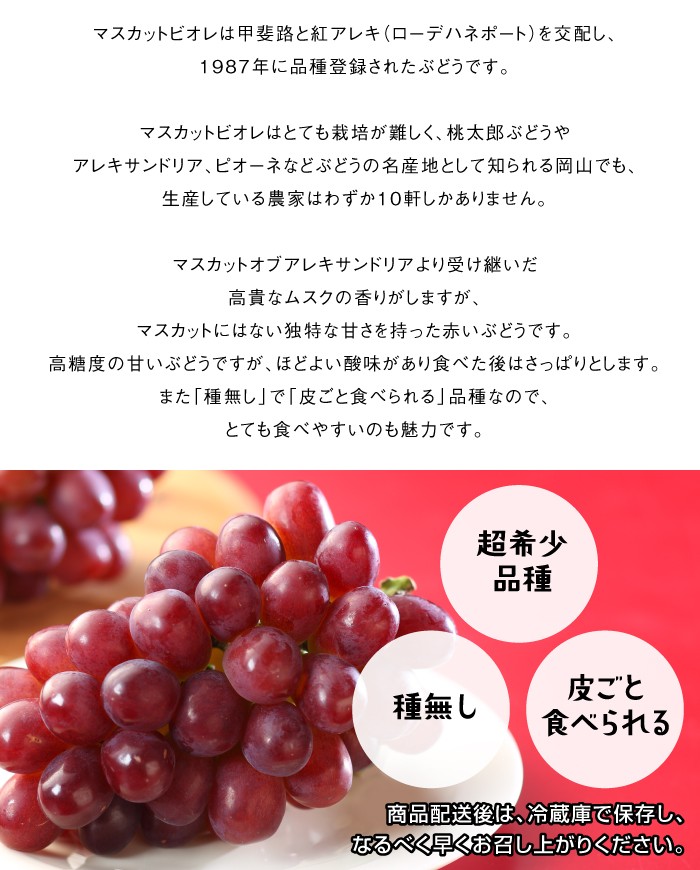マスカットビオレは糖度が高く、種無しで皮ごと食べられる冬の葡萄です。しかしとても栽培が難しく、ぶどうの名産地として知られる岡山県でも生産者がほとんどいない希少な品種です。上品なマスカットの香りと濃いルビー色の美しさは、一度食べると忘れられなくなる魅力にあふれています。