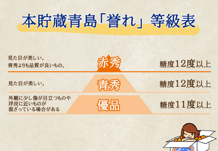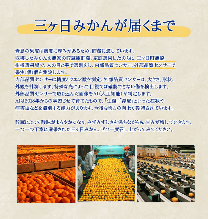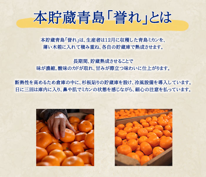 本貯蔵青島「誉れ」は、徹底した温度・湿度管理のもとで長期間貯蔵し、甘みとコクを凝縮させた味わいの深いみかんとなっております。