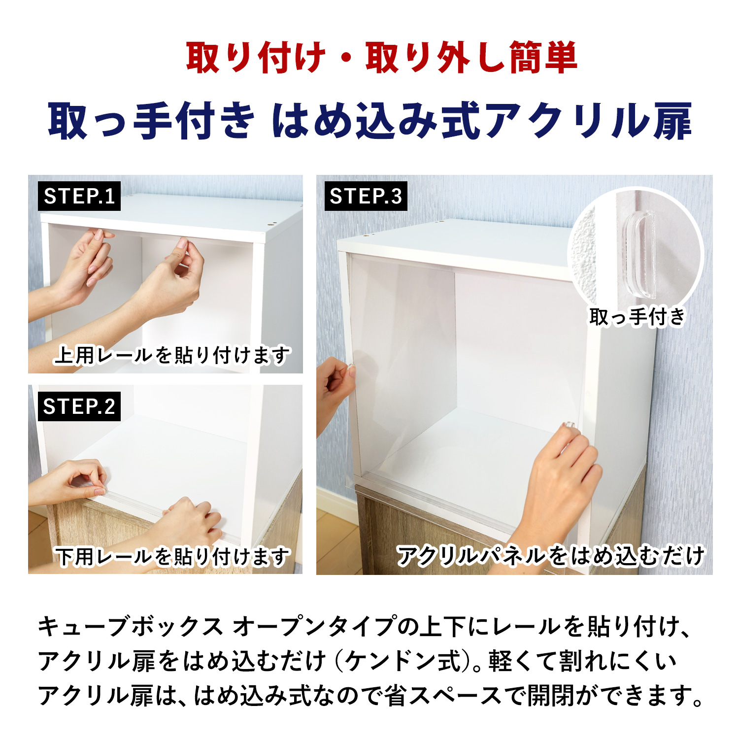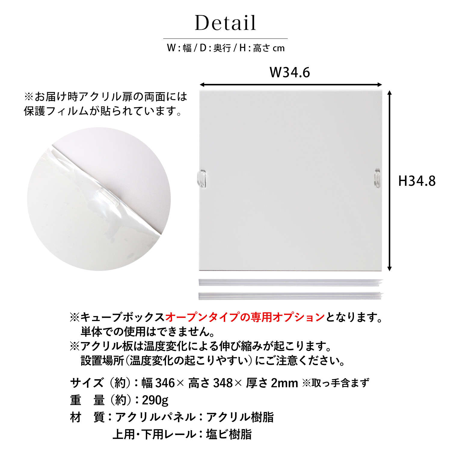 | コレクションキューブボックスオープンタイプ本体と、オープンタイプ専用オプションのアクリル扉のセットです。 ◇取り付け簡単!持ち手の付いたはめ込み式のアクリル扉。 ◇大切なコレクションをホコリと紫外線から守るUVカット仕様。 ◇上下にレールを貼り付け、アクリル扉をはめ込むだけ(ケンドン式) ◇はめ込み式なので省スペースで開閉できます。 ◇紫外線によるコレクションの劣化を大幅に軽減するUVカットアクリルを使用。 |