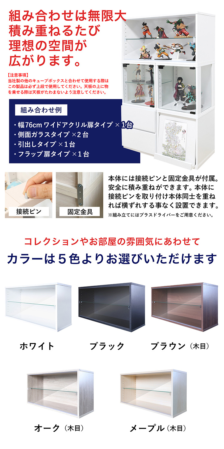 | 【組み合わせてあなただけの専用ケースに】 組み合わせ自由。付属の連結ピンと固定金具を使用し3段まで積み重ねる事ができるキューブボックスシリーズ。 お気に入りのタイプと専用オプションを取り付ければあなただけのコレクションケースに変身。 コレクションキューブボックス【CCB】に積み重ねできるワイドタイプ(幅38cmタイプ2台分) 紫外線からコレクションを守る幅76cmワイドUVカット アクリル扉タイプ。 黄ばみ、劣化の原因となる紫外線からコレクションを守ります。 取っ手付きはめ込み式アクリル扉だから省スペースで開閉できます。 ガラス棚板1枚付きでお好みのレイアウトが楽しめます。 |