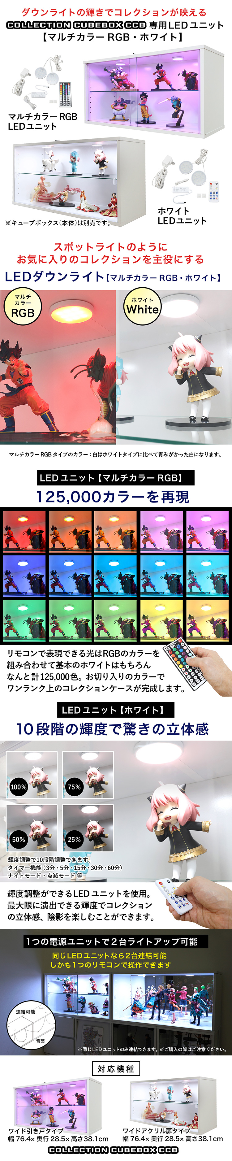 | 【組み合わせてあなただけの専用ケースに】 組み合わせ自由。付属の連結ピンと固定金具を使用し3段まで積み重ねる事ができるキューブボックスシリーズ。 お気に入りのタイプと専用オプションを取り付ければあなただけのコレクションケースに変身。 コレクションキューブボックス【CCB】ワイドタイプ専用オプションLEDユニットマルチカラーRGB・ホワイト 連結できるダウンライトLEDユニット(マルチカラーRGB・ホワイト)の輝きでお気に入りのコレクションを主役にします。 ホワイトはもちろん125,000カラーを再現できるRGBマルチカラーLEDユニット。 圧倒的なホワイト色で驚きの立体感。10段階輝度調整可能なホワイトLEDユニット。 ※RGBマルチカラーLEDユニットのホワイト色はホワイトLEDユニットに比べて青みがかったホワイトになります。 |
