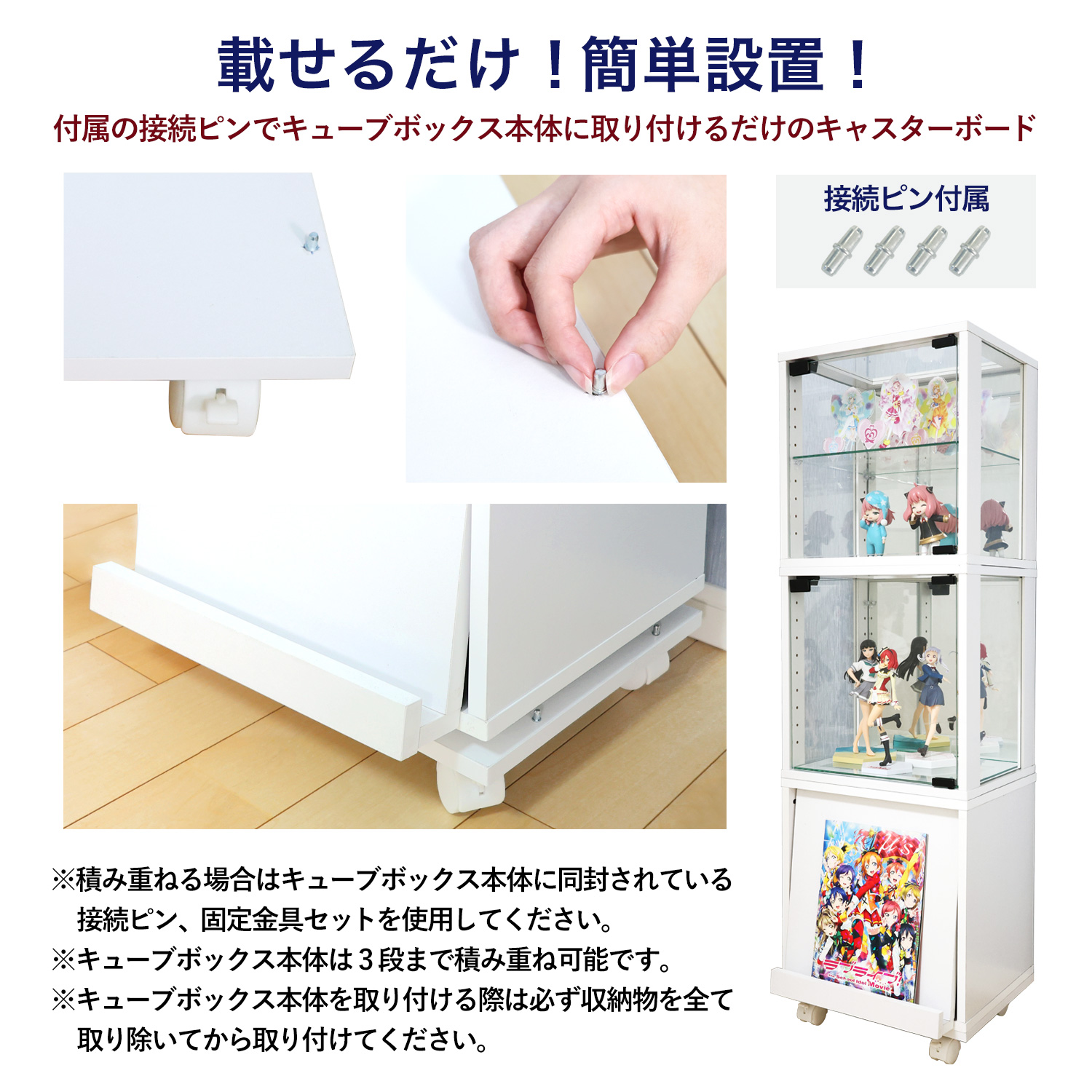 | ◇移動に便利なキューブボックス専用ストッパー付きキャスター台。 ◇キューブボックスの移動・設置がラクラク。 ◇付属の接続ピンでキューブボックス本体に取り付けるだけ。 ◇前輪には安心・安全のストッパー付きキャスターを使用。 |
