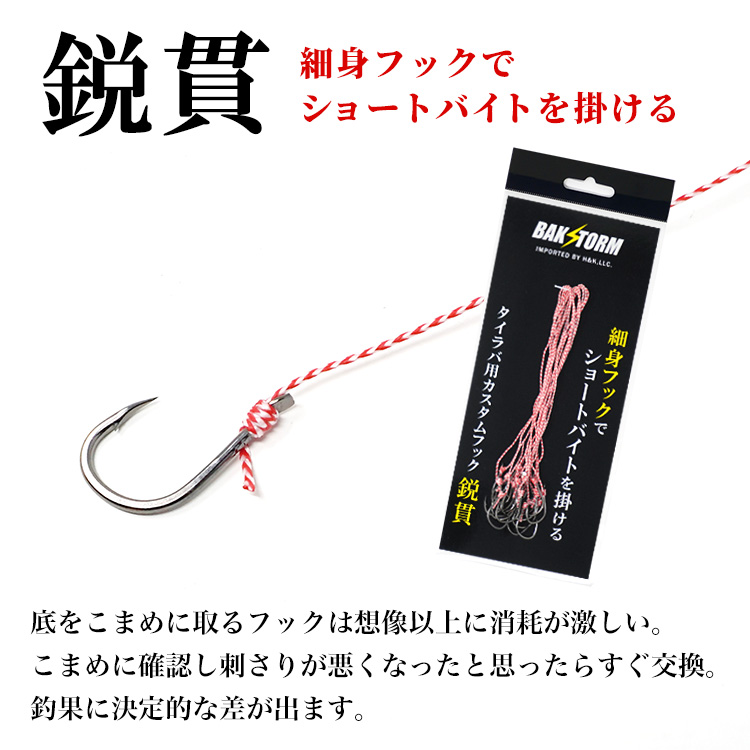 | ◇細身フックでショートバイトを掛ける。底をこまめに取るフックは想像以上に消耗が激しい。こまめに確認し刺さりが悪くなったと思ったらすぐ交換。釣果に決定的な差が出ます。 ◇バランスの取れた伊勢尼型ハリは腰曲げからの先曲げにかけてカーブが均等でゆるやかな伊勢尼型。胴の長さが短く、ハリ先も長くすっぽ抜けしづらいバランスのとれた型です。 ◇バクストがタイラバ用に厳選した各種ネクタイ(別売)と専用タイラバ用スイベル(別売)を使用して自分のフィールドに合ったタイラバにカスタマイズして楽しもう! ※商品の色や質感は撮影時の光加減やモニタ画面により異なります。 |