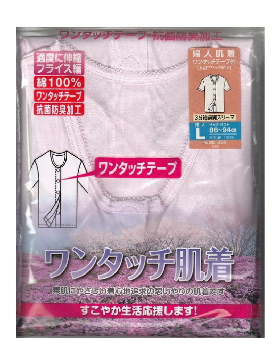 婦人前開3分袖 ワンタッチ肌着着脱がラクにできるワンタッチ肌着ピンク・白 M・L・LL 綿100% 新22-356