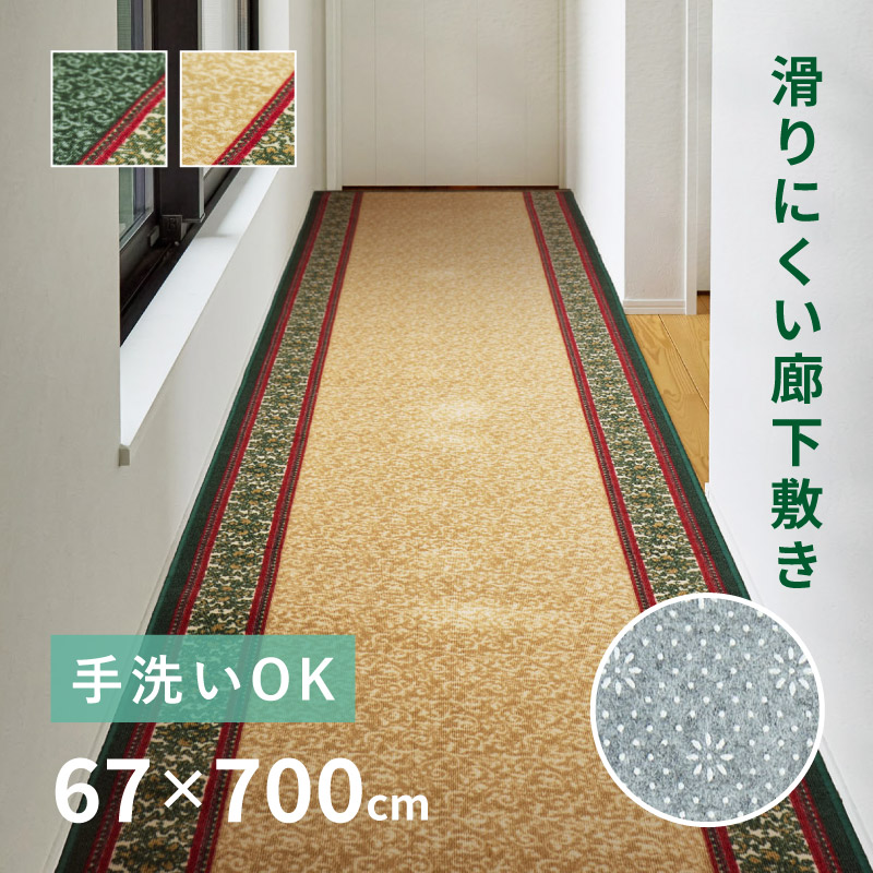 廊下敷き 廊下カーペット 廊下 カーペット ロング 67×700cm 滑り止め 手洗い可 洋風 ベージュ グリーン ヨーロピアン ナタリア
