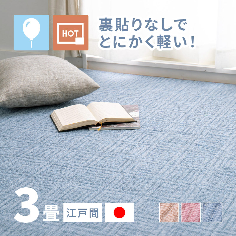 軽量カーペット。一人暮らしでも持ち運び楽々。弾力があり復元性に優れていてへたりにくく、ふかふかとした肌触りが特徴。