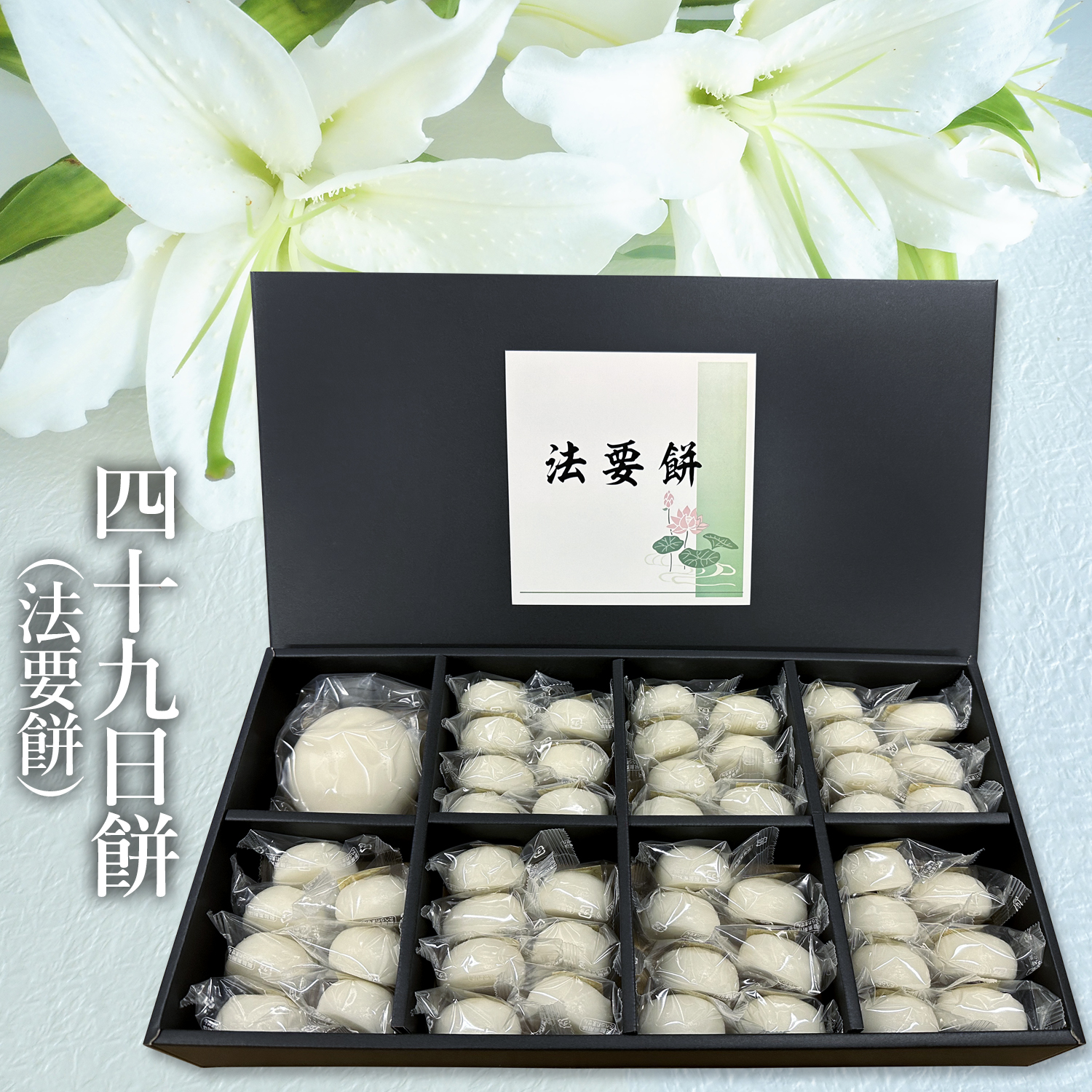 Q「四十九餅(法要餅)」とは何ですか?中陰明けの法事を行い、故人の供養と成仏を願うために四十九日に親類縁者が集まり、お坊様より御経をあげていただきます。その時に御供えするものが「四十九個の餅」です。