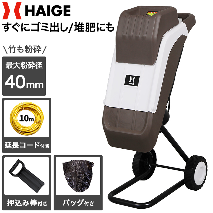 ハイガー ガーデンシュレッダー 電動粉砕機 竹 枝 木 小型 家庭用 ダストバッグ付き(10m延長コード付)HG-BSLD01DA