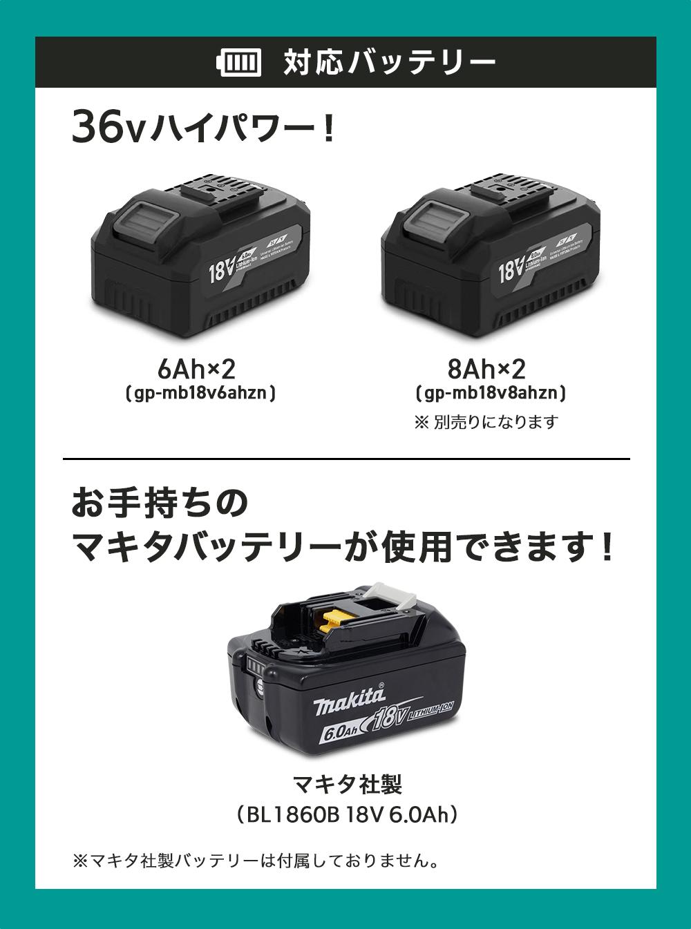 | 対応バッテリ 連続運転時間 (満充電)※ | 付属品 GP-MB18V6AHZ (6Ah)x2 | 約36分(無負荷)/約9分(フル不可) |