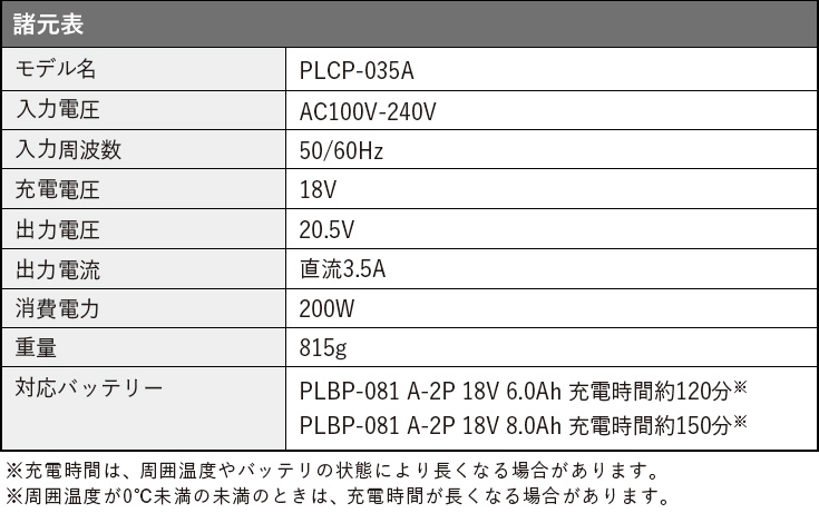 対応バッテリー:PLBP-081A-2P6Ah、PLBP-081A-2P8Ah