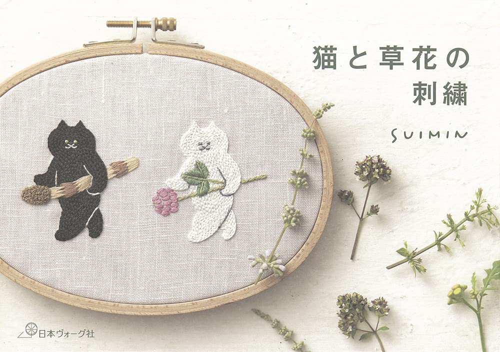 猫と草花の刺繍
