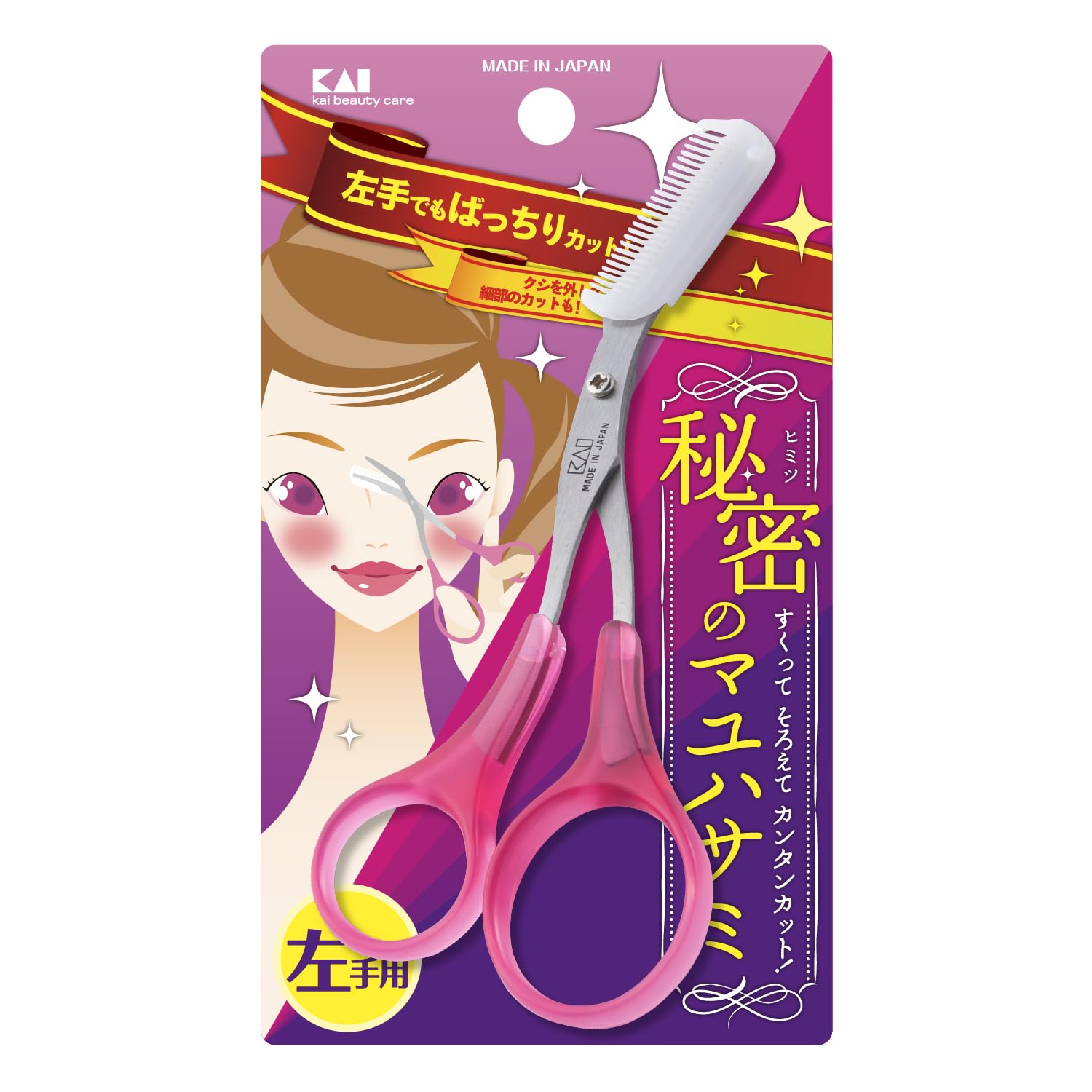 貝印 KAI 眉毛 ハサミ 左手用 コーム 付 つけはずし可 カット レディース ピンク 日本製 KQ3034