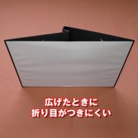 スクリーンはウレタン素材で、広げたときに折り目がつきにくい。スクリーン面の色は蛍光白色で、レーザープロジェクターはもちろん、LEDプロジェクターで投映した映像が鮮やかに映ります!