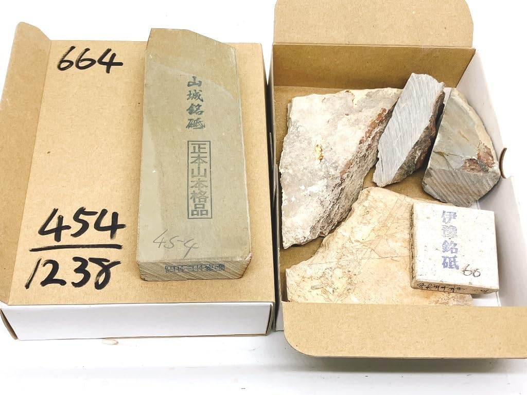 色:中世山城銘砥 山本流鍛え済原石 函外寸(概寸)肥後守十丁箱入約454-1238g #box664 天然砥石